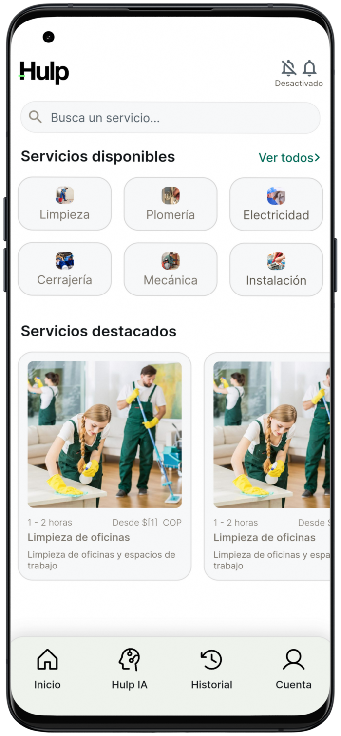 Hulp is a Colombian service platform connecting clients with trusted handyman professionals. The Client App was developed for users seeking services, offering a simple interface to find, hire, and track professionals.
